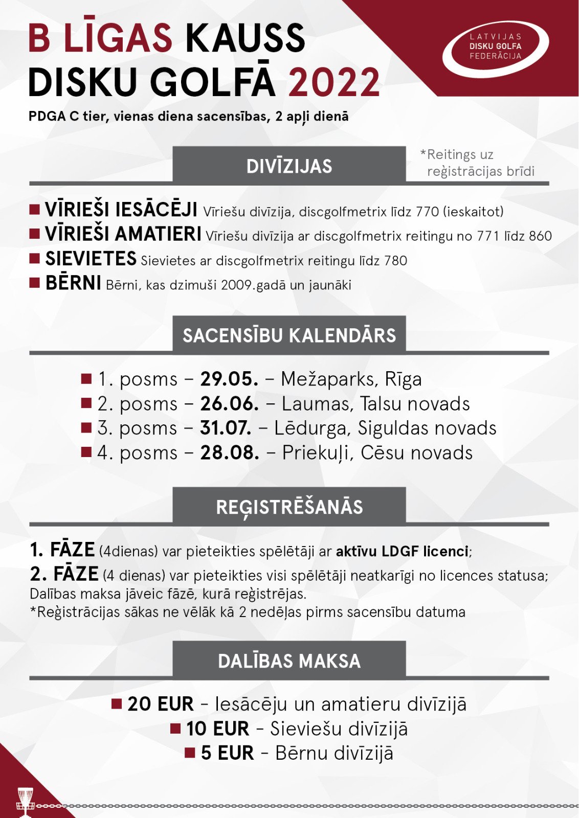 Atgādinam, ka dalības maksa jāveic tās fāzes laikā, kurā jūs reģistrējaties sacensībām. Tātad, līdz 10.jūnijam visiem kas reģistrēsies pirmajā fāzē jābūt veikušiem dalības maksu. Tie kas nebūs to izdarījuši vai būs reģistrējušies bez vai ar neaktīvu LDGF licenci pirms otrās fāzes sākuma tikdz dzēsti no spēlētāju saraksta.